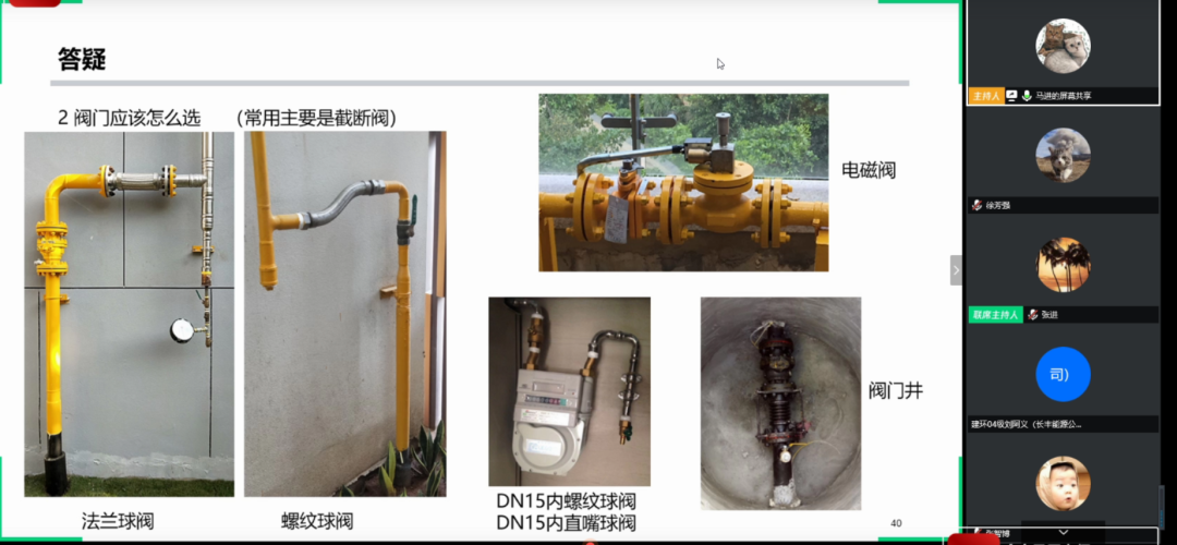 刘阿义又对管材、设备的选择以及管道入户方案的设计进行了补充。在对于管材的选择上,需要考虑管道的使用条件,比如说设计压力、温度、介质特性、使用地区、材料的焊接性能等,并且以海南、上海、东北等地区的管材选择进行了逐一的分析,不同地区选用的管材也有一定的区别。同时,刘阿义学长向大家介绍了多种管道入户设计案例,根据安装环境、房型等情况因地制宜,巧妙的采用不同的设计理念,在严格遵守燃气相关规范的情况下,考虑安全性、经济性、美观性等,做到真正的艺术设计。