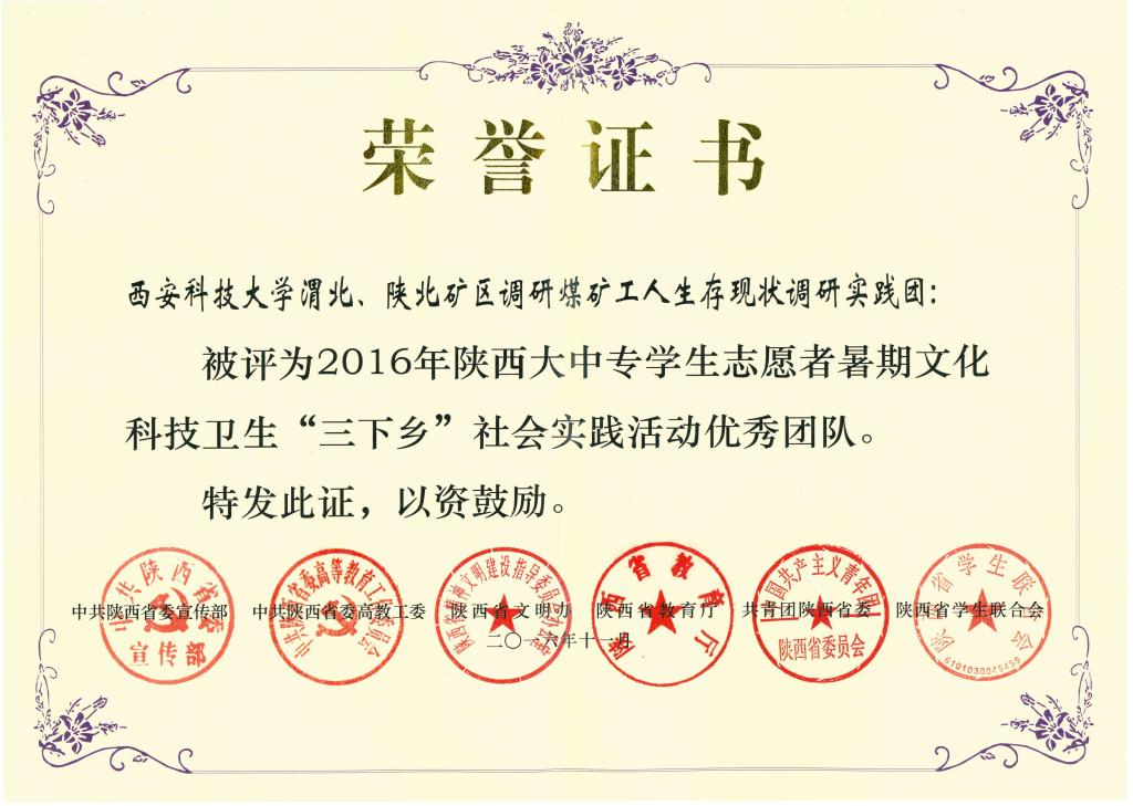 11月7日,中共陕西省委宣传部、中共陕西省委高教工委、陕西省文明办等部门联合下发《关于2016 年陕西大中专员工志愿者暑期文化科技卫生“三下乡”社会实践活动先进集体、先进个人的通报》(陕团联发〔2016〕66 号)文件,其中,公司暑期老员工赴渭北、陕北矿区煤炭工人生存现状调研团被中共陕西省委宣传部、省委高教工委、省文明办、省教育厅、团省委和省学联等六部门联合授予“2016年陕西省大中专员工志愿者三下乡社会实践活动优秀团队”荣誉称号。