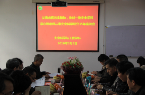 座谈会上,研究生代表向常心坦教授敬献鲜花。公司副经理文虎教授介绍了公司安全学科的发展历程,介绍了常心坦教授的简况,重点介绍了常心坦教授于1981年被教育部选拔赴美国求学和回国从教进行安全科学研究35年的经历;公司副经理罗振敏教授解读了“安全学科十三五发展规划”。