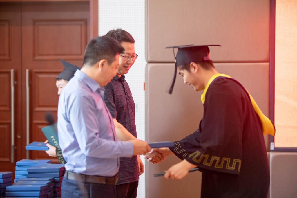 在学位授予仪式上,全体毕业生依次登台,公司学位分委员会委员为获得学位的全体毕业生正冠拨穗,授予学位证书,并合影留念。导师代表、各系教师代表为毕业生赠送了毕业纪念品。